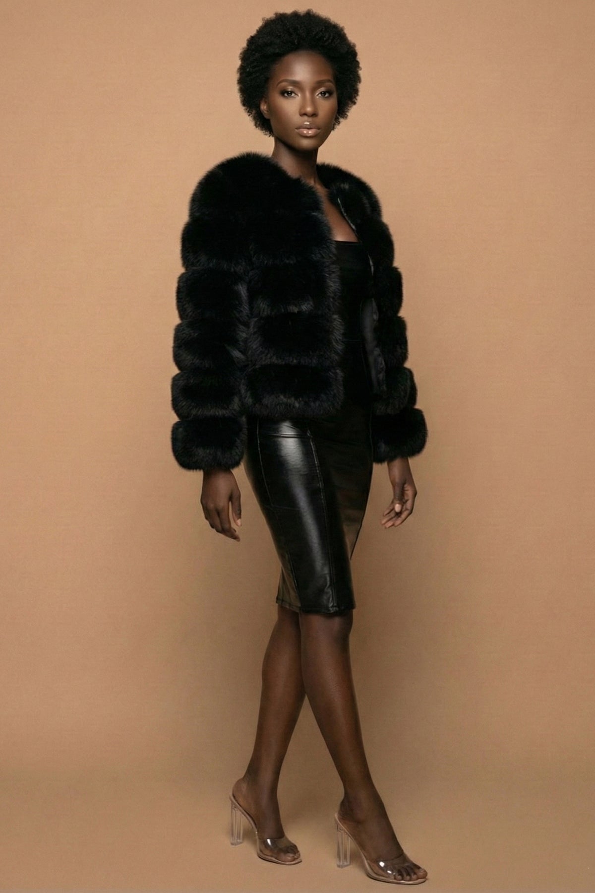 The wide shawl collar frames the neckline beautifully, while horizontal fur paneling adds depth, structure, and elevated texture. Perfect for nights out, special occasions, or anytime your look needs a statement finish.