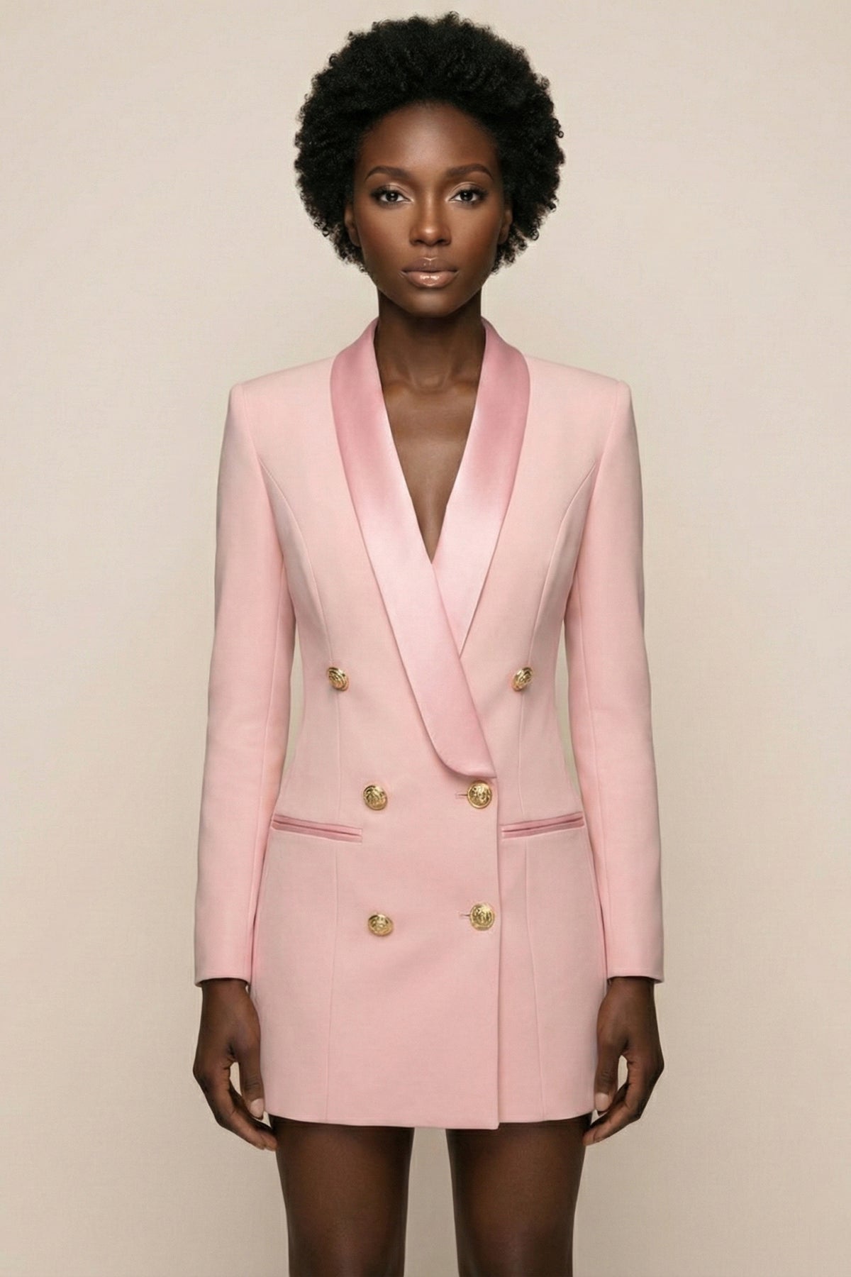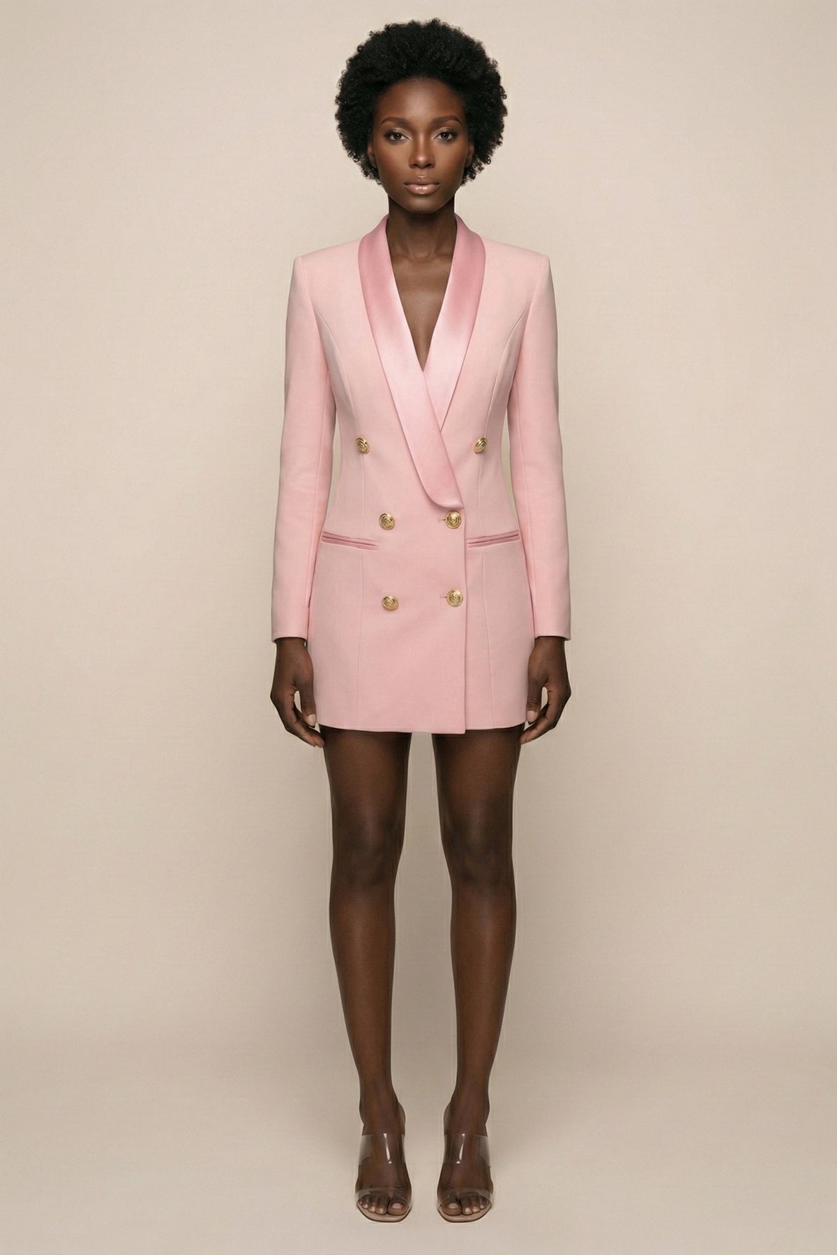 The Artistry We focused on the silhouette, featuring strong, padded shoulders that taper down into a perfectly cinched waist to create an hourglass shape. The drama lies in the details: contrasting satin peak lapels that catch the light and six signature gold-crest buttons that act as jewelry for your bodice. The double-breasted closure ensures a secure fit, while the mini cut elongates the legs for days.