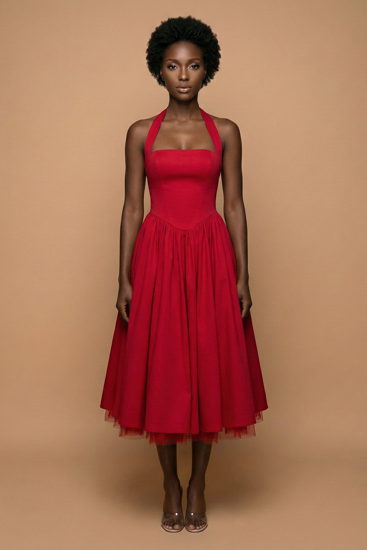 Refined, feminine, and undeniably striking, the Scarlet Halter Corset Midi Dress is designed to turn movement into a moment. The structured bodice sculpts the upper body with a clean, tailored fit, while the flowing midi skirt creates soft drama with every step.
