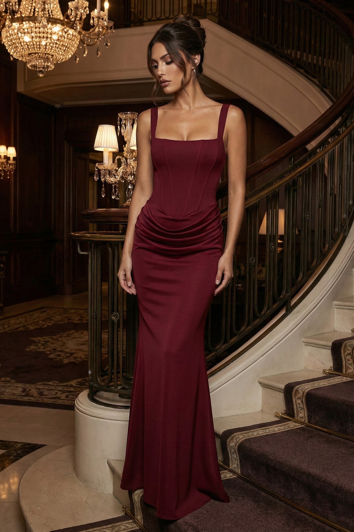 We selected this piece for its architectural approach to the female form. The bodice is constructed with visible exterior boning, creating a rigid, corset-like structure that sculpts the torso and lifts the bust. We were captivated by the masterful draping across the hips—a swag of fabric that accentuates the waist-to-hip ratio before the skirt falls into a sleek, floor-grazing column. The square neckline frames the décolletage beautifully, offering a modern edge to a classic silhouette.