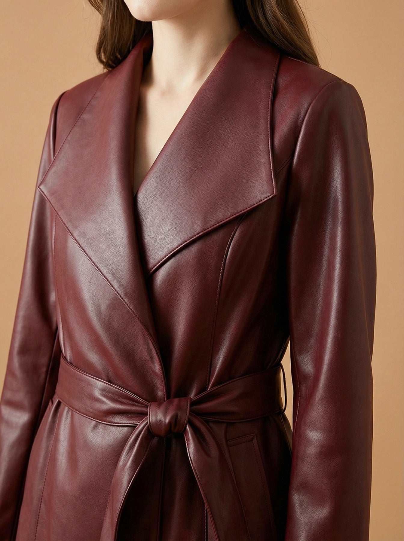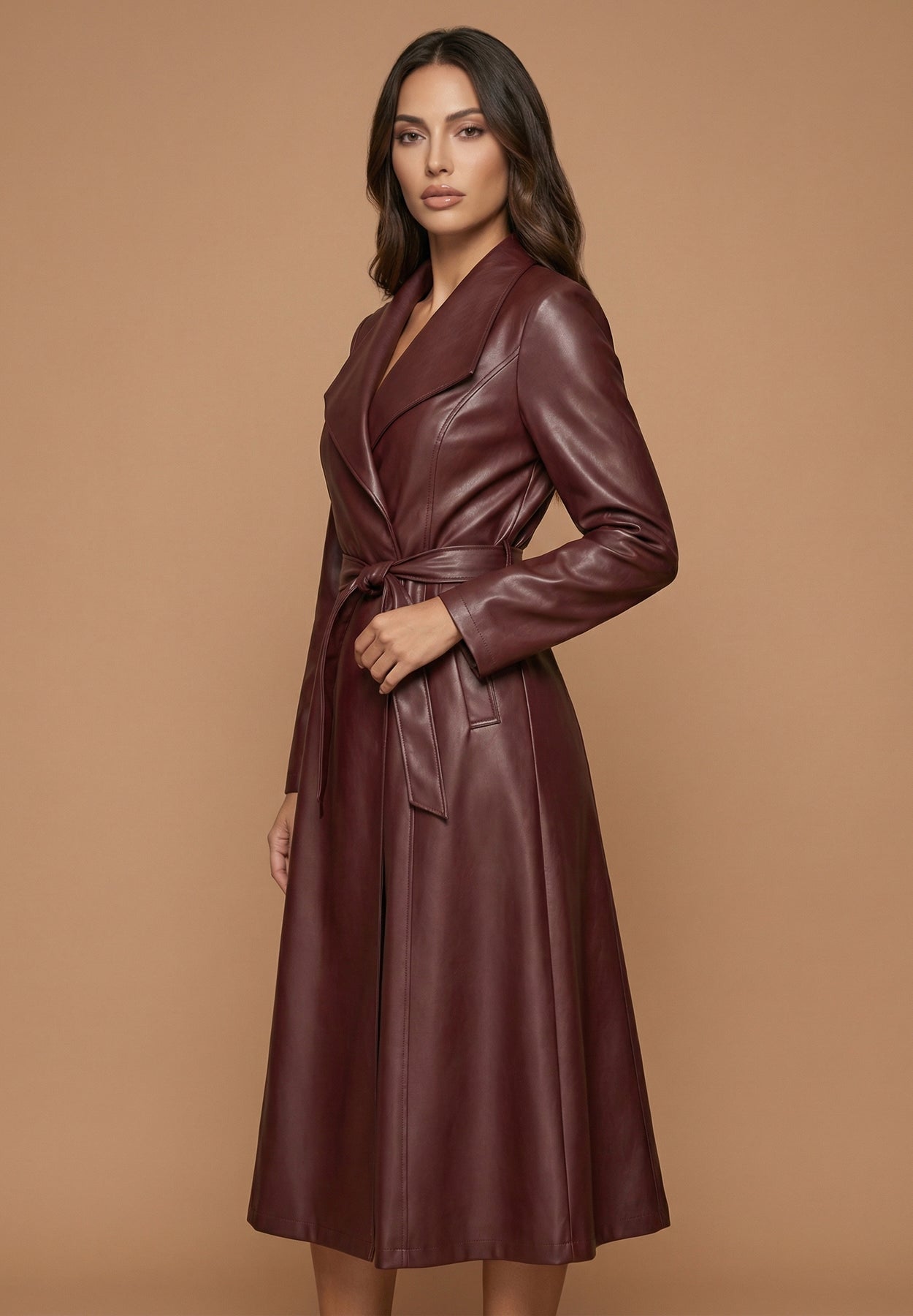 The Verona is sculpted to flatter and designed to endure. Crafted in smooth burgundy pleather with a soft satin sheen, this trench features wide notched lapels that create structure through the shoulders and draw the eye inward toward the waist.