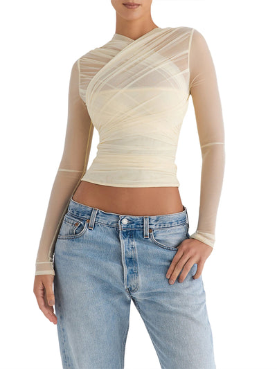 Sheer Wrap-Neck Ruched Long Sleeve Top with Back Zip