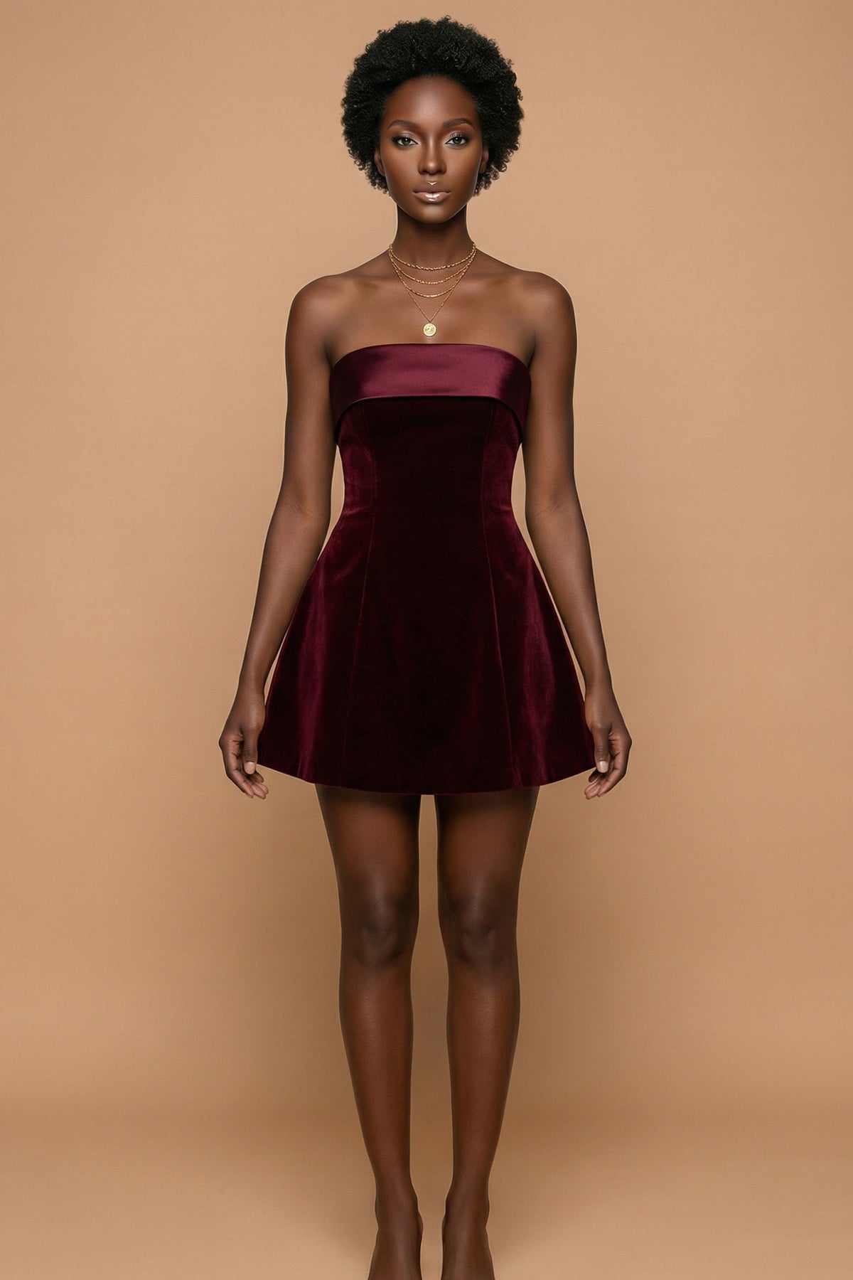 Curated for the woman who understands the richness of burgundy. Burgundy is the new black, a display of dominance. The 'Celine' velvet mini was selected for the "cool girl" aesthetic—it captures the mood of a late-night rendezvous in Paris. Whether you're sipping a martini at a hotel bar or heading to a gallery opening, this piece ensures you are the focal point.