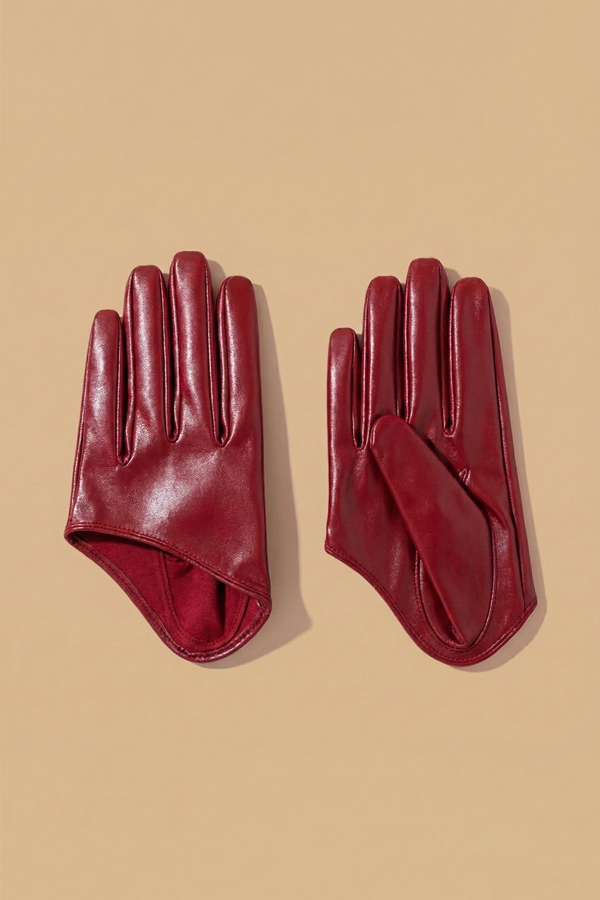 Crafted from smooth PU faux leather in a rich oxblood tone, these half gloves are designed with precision and restraint. The fingers are fully enclosed and elongated, creating a sleek silhouette, while the cropped cuff ends just below the knuckles for a sharp, modern finish. Clean stitched seams run straight along the fingers, enhancing the tailored look without excess bulk. The leather has a soft, natural sheen that feels polished, not glossy, and the interior is finished for comfort and ease of wear.