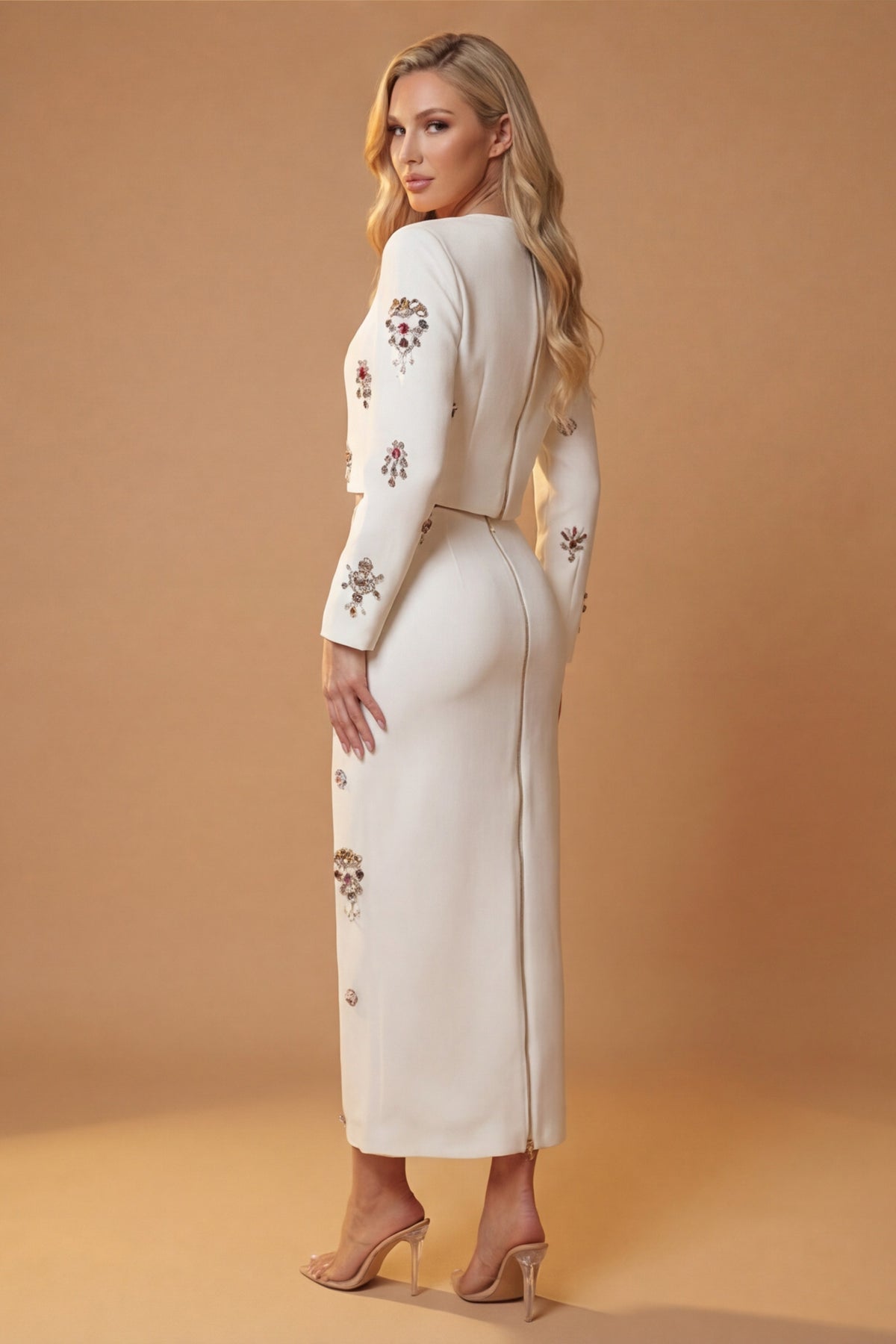 The Artistry Sculpted from a premium heavyweight crepe polyester, the artistry lies in the impeccable silhouette that cinches the waist and elongates the frame. Hand-finished crystal clusters and delicate pearl droplets are scattered across the bodice and maxi skirt, acting as jewelry for your silhouette. Signature gold-tone hardware runs the full length of the back, ensuring the fit is as secure as it is striking.